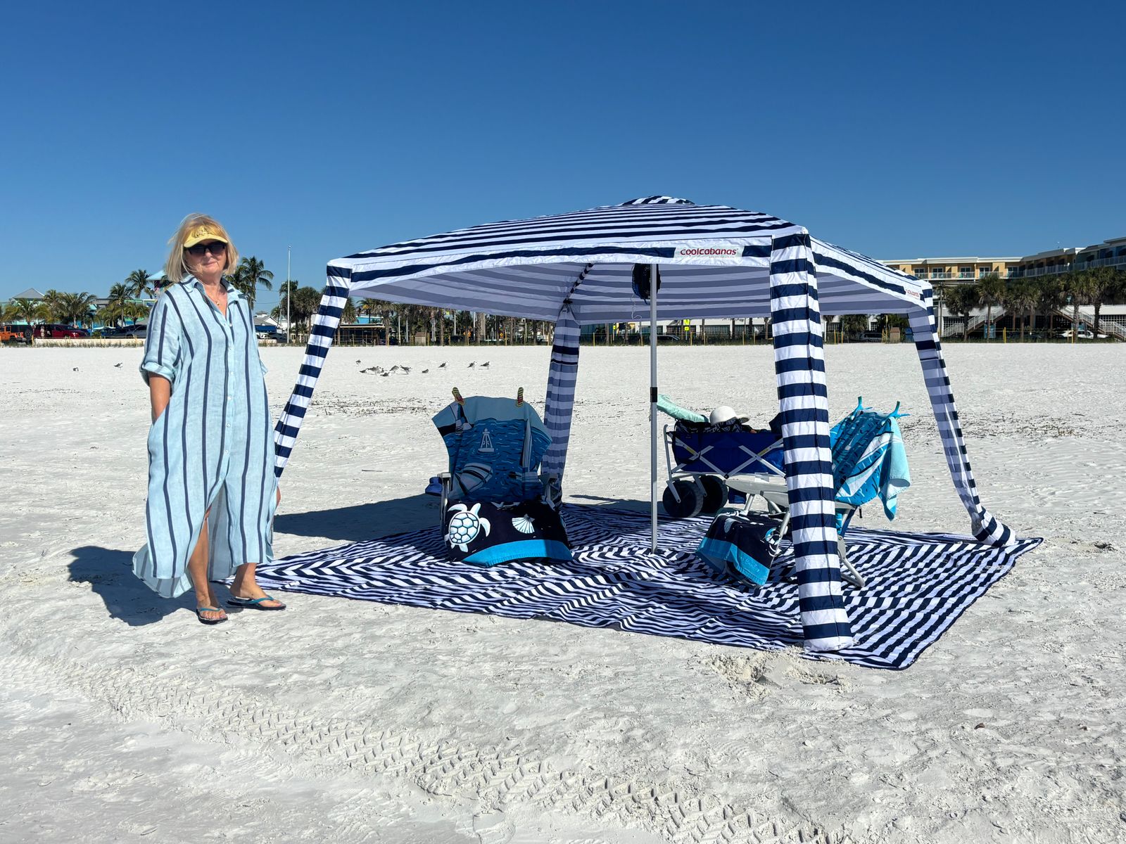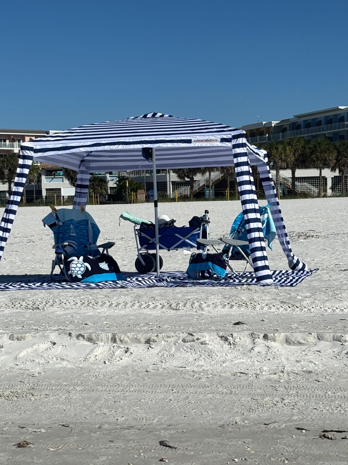 We’ve really enjoyed the cabana but then I saw the matching mat on Fort Myers Beach. The owner said it’s perfect for keeping sand from getting all over everything but strongly recommended the XL mat. We love it. This duo is fast and easy to set up and take down. East to carry. It allows us to stay comfortable all day on any beach. It’s big enough for the family plus grandkids. Don’t wait!